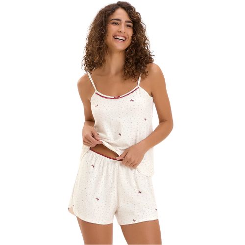 Pijama feminino alças e shorts, confeccionado em malha canelada visco comfy, oferecendo um toque suave e confortável. Seu design é realçado pelo acabamento de renda delicada na barra e no decote trazendo um charme sutil e elegante para suas noites de descanso. Perfeito para quem busca conforto sem abrir mão do estilo!